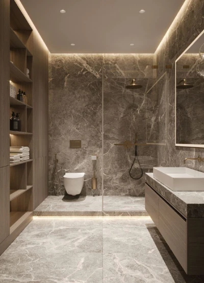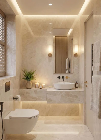 In 2025, the most sought-after bathroom interior designs focus on creating a “home spa” experience. This involves moving away from clinical white spaces toward warm, moody palettes like oxblood, emerald green, and deep earthy tones. At Smart Tech Interiors, we integrate premium materials such as bold, veined marble slabs and gunmetal fixtures to create a sophisticated, dramatic atmosphere. By focusing on “material drenching”—using the same stone or color from floor to ceiling—we create a seamless, high-end look that turns a standard bathroom into a private sanctuary.