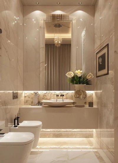 Great bathroom interior designs require smart space planning, especially in compact urban homes. To maximize a limited footprint, we utilize “floating” vanities and wall-mounted toilets that keep the floor clear, instantly making the room feel larger. Our designers often recommend large-format tiles to minimize grout lines, creating a sleek, uninterrupted visual flow. By incorporating recessed niches for storage and frameless glass shower enclosures, we ensure that even the smallest half-bath offers a sense of openness and luxury without compromising on functionality.